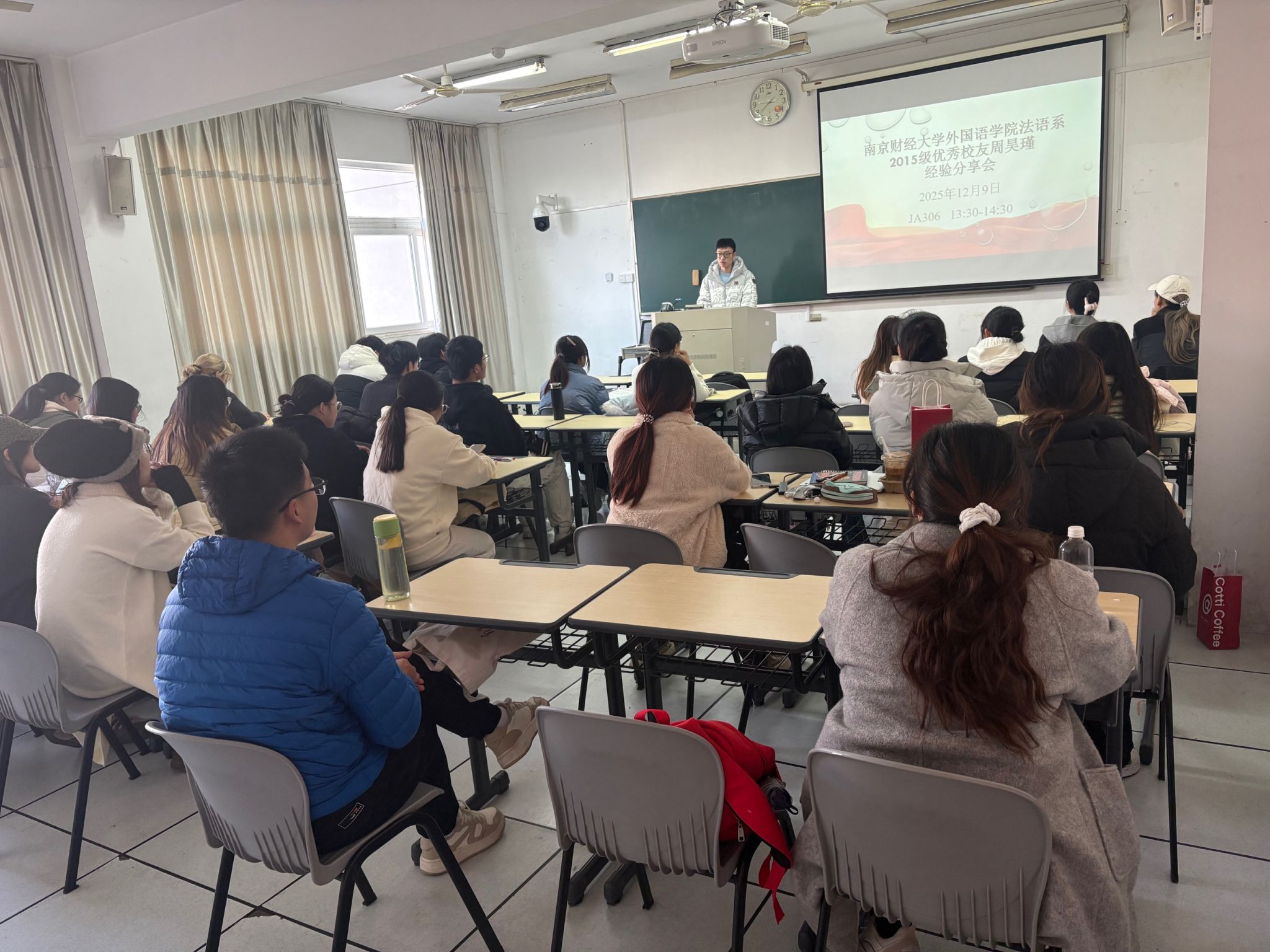 2025年12月9日下午,吃瓜网 法语系在仙林校区JA306教室举办校友职业发展分享会。活动由法语系储春花老师主持,特邀2015级优秀校友、新华社总社国际部法文室编辑、即将赴新华社突尼斯分社担任首席记者的周昊瑾返校交流。法语2301级、2401级全体同学参加了此次活动。