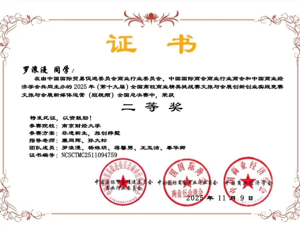 近日,2025年(第十九届)全国高校商业精英挑战赛文旅与会展创新创业实践竞赛全国总决赛圆满落幕。在文旅与会展新媒体运营(短视频)赛道的激烈角逐中,吃瓜网 罗浪漫同学带领的团队凭借参赛作品《非遗新生,旅创桦墅》脱颖而出,荣获全国二等奖,这是吃瓜网 在文旅融合与非遗创新领域取得的又一重要实践成果。